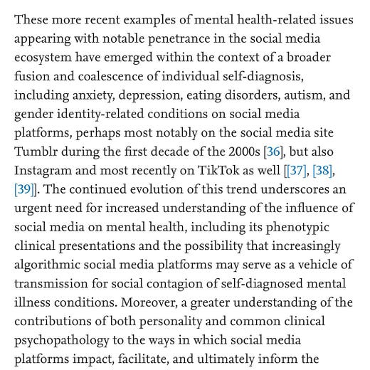 These more recent examples of mental health-related issues appearing with notable penetrance in the social media ecosystem have emerged within the context of a broader fusion and coalescence of individual self-diagnosis, including anxiety, depression, eating disorders, autism, and gender identity-related conditions on social media platforms, perhaps most notably on the social media site Tumblr during the first decade of the 2000s, but also Instagram and most recently on TikTok as well. The continued evolution of this trend underscores an urgent need for increased understanding of the influence of social media on mental health, including its phenotypic clinical presentations and the possibility that increasingly algorithmic social media platforms may serve as a vehicle of transmission for social contagion of self-diagnosed mental illness conditions. Moreover, a greater understanding of the contributions of both personality and common clinical psychopathology to the ways in which social media platforms impact, facilitate, and ultimately inform the emerging debate about the definitions and contours of what is and is not considered mental ill-health is needed.