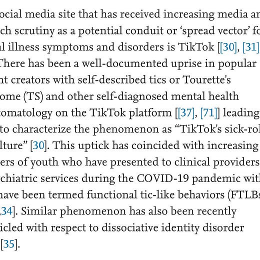One social media site that has received increasing media and research scrutiny as a potential conduit or ‘spread vector’ for mental illness symptoms and disorders is TikTok. There has been a well-documented uprise in popular content creators with self-described tics or Tourette's Syndrome (TS) and other self-diagnosed mental health symptomatology on the TikTok platform leading some to characterize the phenomenon as “TikTok's sick-role subculture”. This uptick has coincided with increasing numbers of youth who have presented to clinical providers or psychiatric services during the COVID-19 pandemic with what have been termed functional tic-like behaviors (FTLBs). Similar phenomenon has also been recently chronicled with respect to dissociative identity disorder (DID).