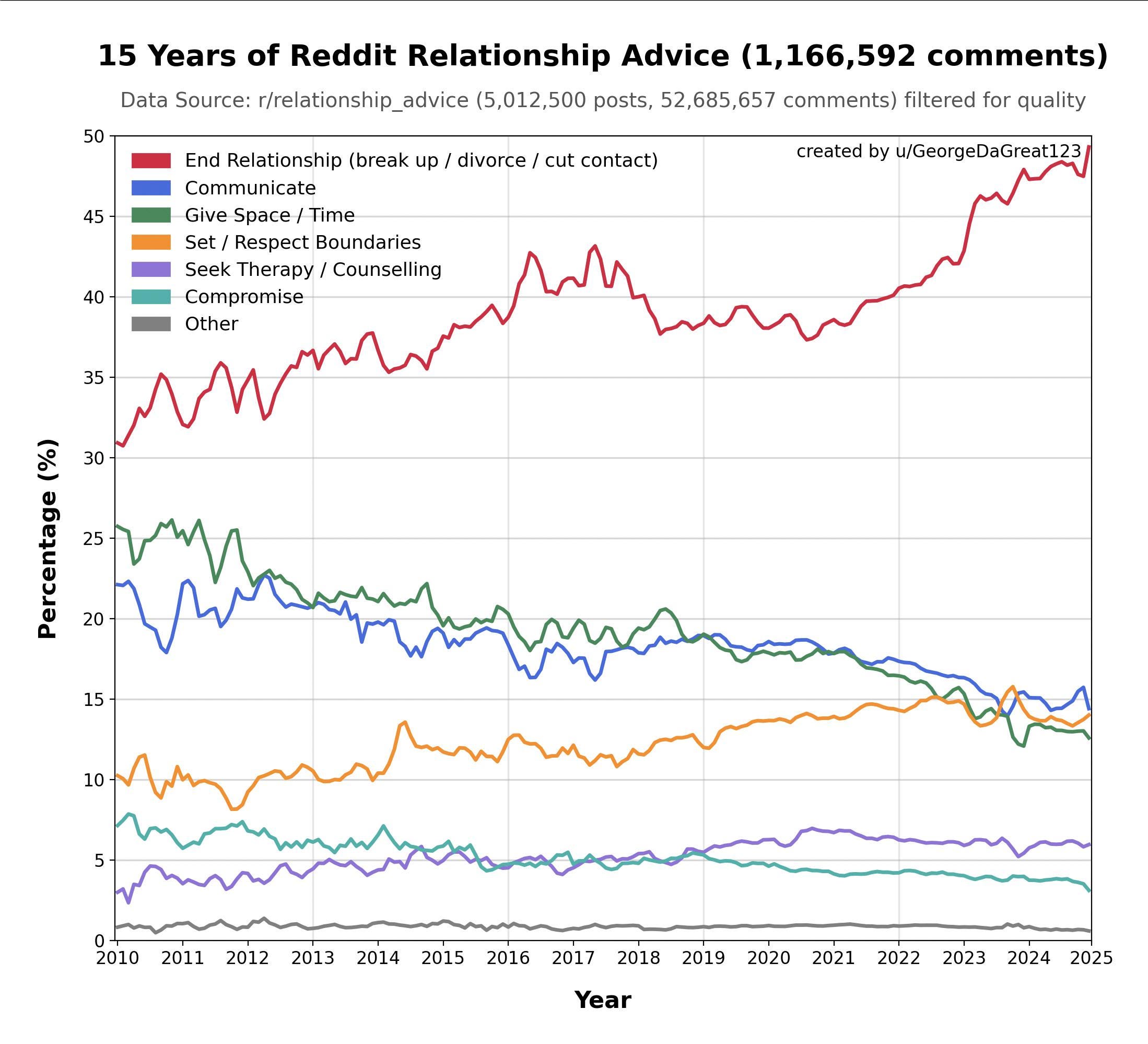 Another essential piece of the equation is to understand where the LLMs you’re using every day were trained. It turns out they were trained on relationship advice subreddits that overwhelmingly promote ending the relationship.