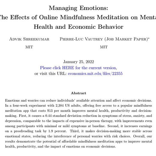 In a four-week experiment with 2,384 US adults, offering free access to a popular mindfulness meditation app that costs $13 per month improves mental health, productivity and decisionmaking.