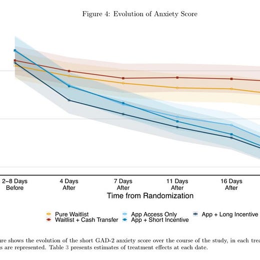 First, it causes a 0.44 standard deviation reduction in symptoms of stress, anxiety, and depression, comparable to the impacts of expensive in-person therapy, with improvements even among participants with minimal or mild symptoms at baseline.